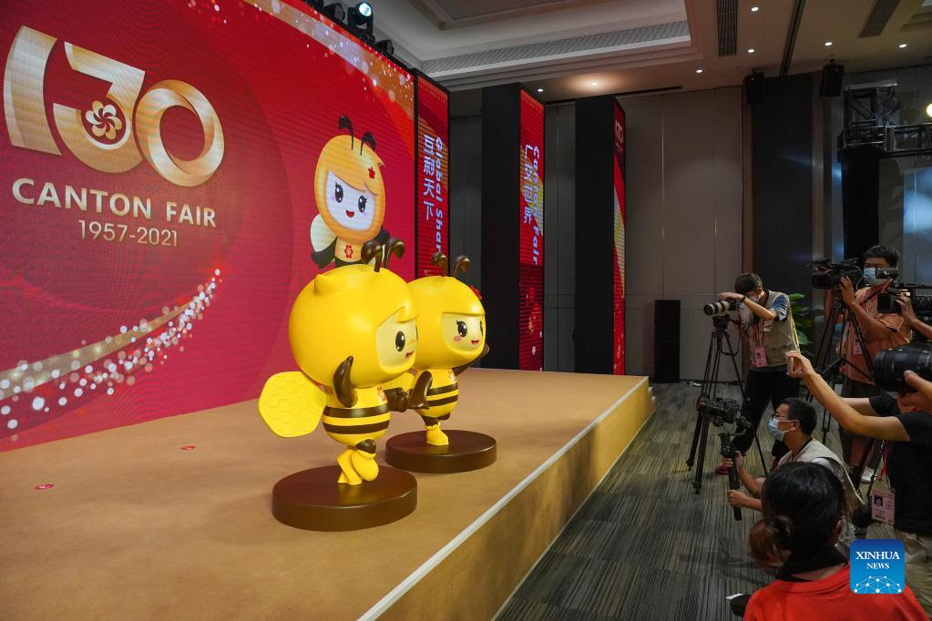 Photo taken on Oct. 9, 2021 shows "Bee" and "Honey", mascots of the 130th session of the China Import and Export Fair, during a press conference in south China's Guangdong Province. The 130th session of the China Import and Export Fair, which will kick off on Oct. 15, 2021, unveiled its mascots "Bee" and "Honey" on Saturday. (Xinhua/Liu Dawei)