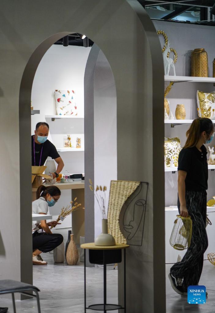 Staff members lay out exhibits at the exhibition center that is going to host the 130th session of the China Import and Export Fair in Guangzhou, south China's Guangdong Province, Oct. 9, 2021. The fair is slated to open here on Oct. 15. (Xinhua/Liu Dawei)