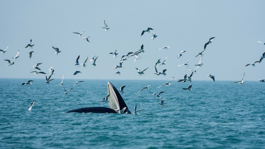 A Bryde's whale forages in waters off Weizhou Island in south China's Guangxi Zhuang Autonomous Region, Jan. 15, 2021. (Xinhua/Liu Jinhai)