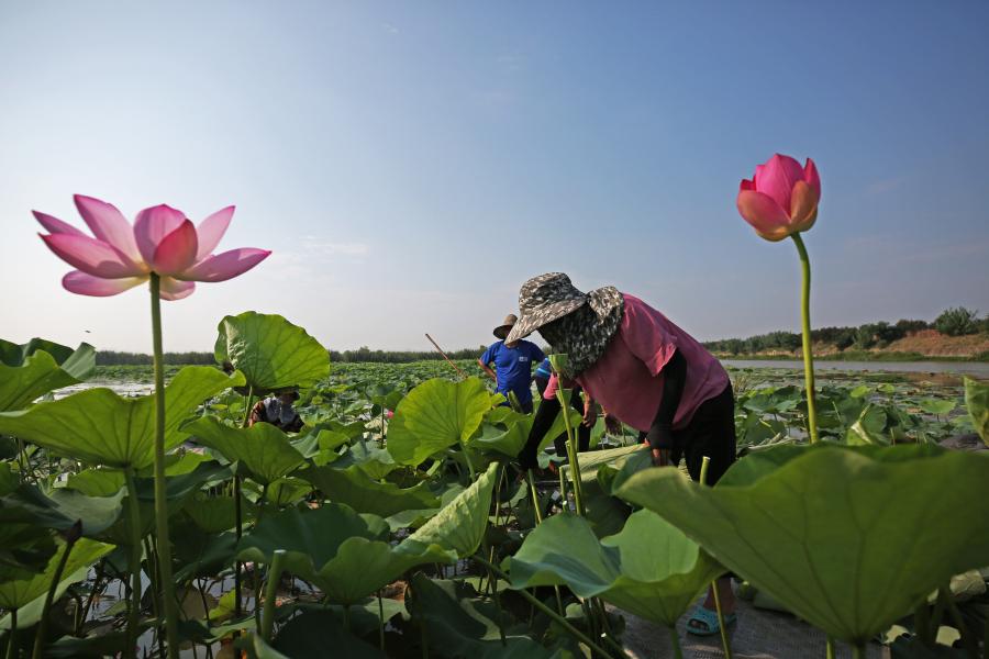 Villagers harvest lotus leaves on the Hongze Lake in Sihong County, east China's Jiangsu Province, July 14, 2021. (Photo by Xu Changliang/Xinhua)