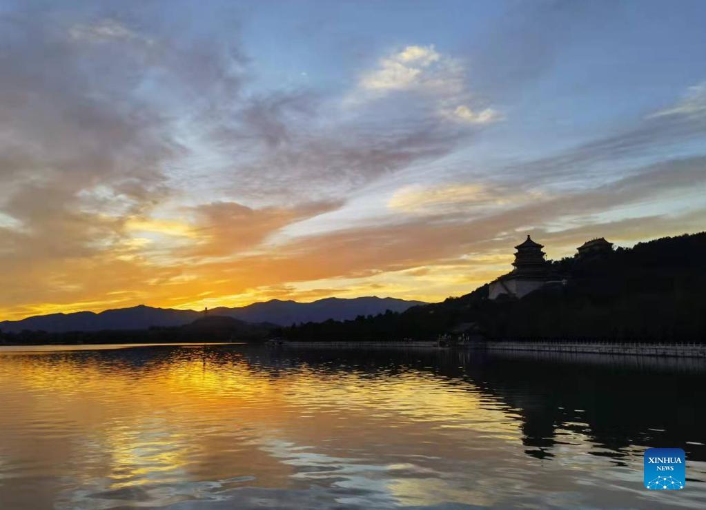 Cellphone photo taken on Oct. 10, 2021 shows the view of sunset glow at the Summer Palace in Beijing, capital of China. (Xinhua/Chen Jianli)