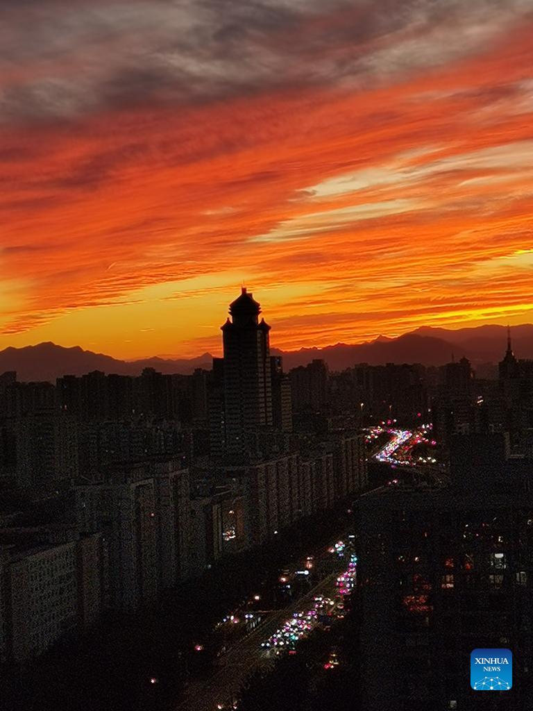 Photo taken on Oct. 10, 2021 shows the view of sunset glow in Beijing, capital of China. (Xinhua/Luo Xiaoguang)