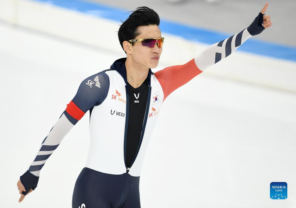 Park Seonghyeon of South Korea gestures after the men's 1500m final at the Experience Beijing Speed Skating China Open in Beijing, capital of China, on Oct. 10, 2021. (Xinhua/Zhang Chenlin)