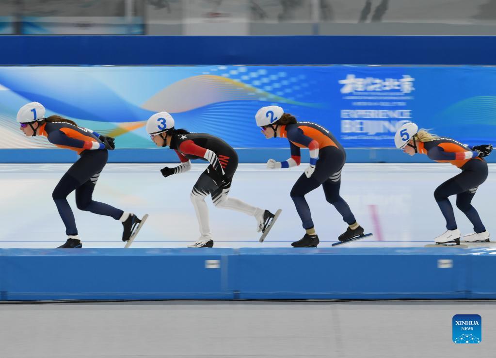 Yang Binyu (2nd L) of China, Sophie Kraaijeveld (1st R), Isabel Grevelt (2nd R), Leonie Bats of the Netherlands compete during the women's mass start competition at the Experience Beijing Speed Skating China Open in Beijing, capital of China, on Oct. 10, 2021. (Xinhua/Zhang Chenlin)