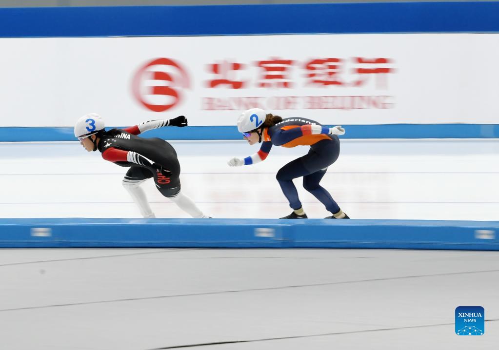 Yang Binyu (L) of China and Isabel Grevelt of the Netherlands compete during the women's mass start competition at the Experience Beijing Speed Skating China Open in Beijing, capital of China, on Oct. 10, 2021. (Xinhua/Zhang Chenlin)
