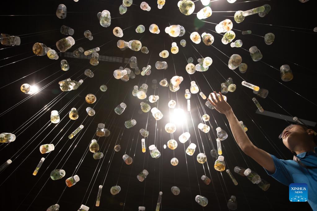 A visitor views samples containing germinated seeds at an exhibition held by the Chinese Academy of Sciences (CAS) in Kunming, southwest China's Yunnan Province, Oct. 10, 2021. Ahead of the 15th meeting of the Conference of the Parties to the UN Convention on Biological Diversity (COP15) in Kunming, CAS held an event on its biodiversity preservation and study, as well as achievements on biodiversity research. (Xinhua/Jin Liwang)