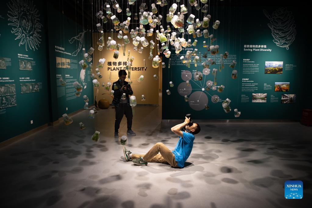 Visitors take photos of samples containing germinated seeds at an exhibition held by the Chinese Academy of Sciences (CAS) in Kunming, southwest China's Yunnan Province, Oct. 10, 2021. Ahead of the 15th meeting of the Conference of the Parties to the UN Convention on Biological Diversity (COP15) in Kunming, CAS held an event on its biodiversity preservation and study, as well as achievements on biodiversity research. (Xinhua/Jin Liwang)