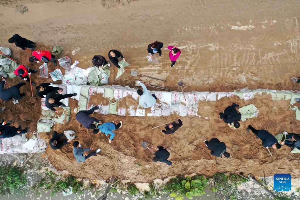 Aerial photo shows rescuers fortifying temporary dyke against the flood at Lianbo Village in Hejin City, north China's Shanxi Province, Oct. 10, 2021. More than 120,000 people have been temporarily evacuated after continuous downpours triggered floods in north China's Shanxi Province, authorities said Sunday. The floods have disrupted the lives of 1.76 million residents from 76 counties, cities and districts, according to the provincial department of emergency management. Some 190,000 hectares of crops were damaged and more than 17,000 houses collapsed, the department said. Emergency management departments of various levels have allocated 4,000 tents, 3,200 folding beds as well as cotton clothes and quilts for disaster relief. (Xinhua/Zhan Yan)