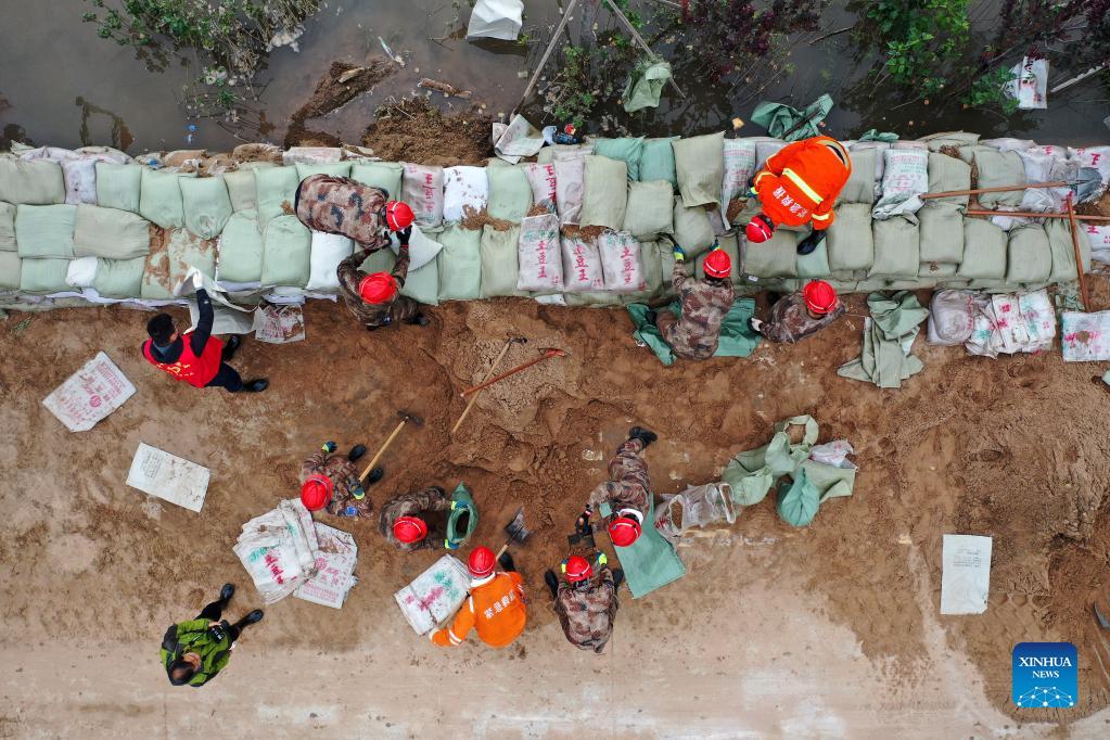 Aerial photo shows rescuers fortifying temporary dyke against the flood at Lianbo Village in Hejin City, north China's Shanxi Province, Oct. 10, 2021. More than 120,000 people have been temporarily evacuated after continuous downpours triggered floods in north China's Shanxi Province, authorities said Sunday. The floods have disrupted the lives of 1.76 million residents from 76 counties, cities and districts, according to the provincial department of emergency management. Some 190,000 hectares of crops were damaged and more than 17,000 houses collapsed, the department said. Emergency management departments of various levels have allocated 4,000 tents, 3,200 folding beds as well as cotton clothes and quilts for disaster relief. (Xinhua/Zhan Yan)