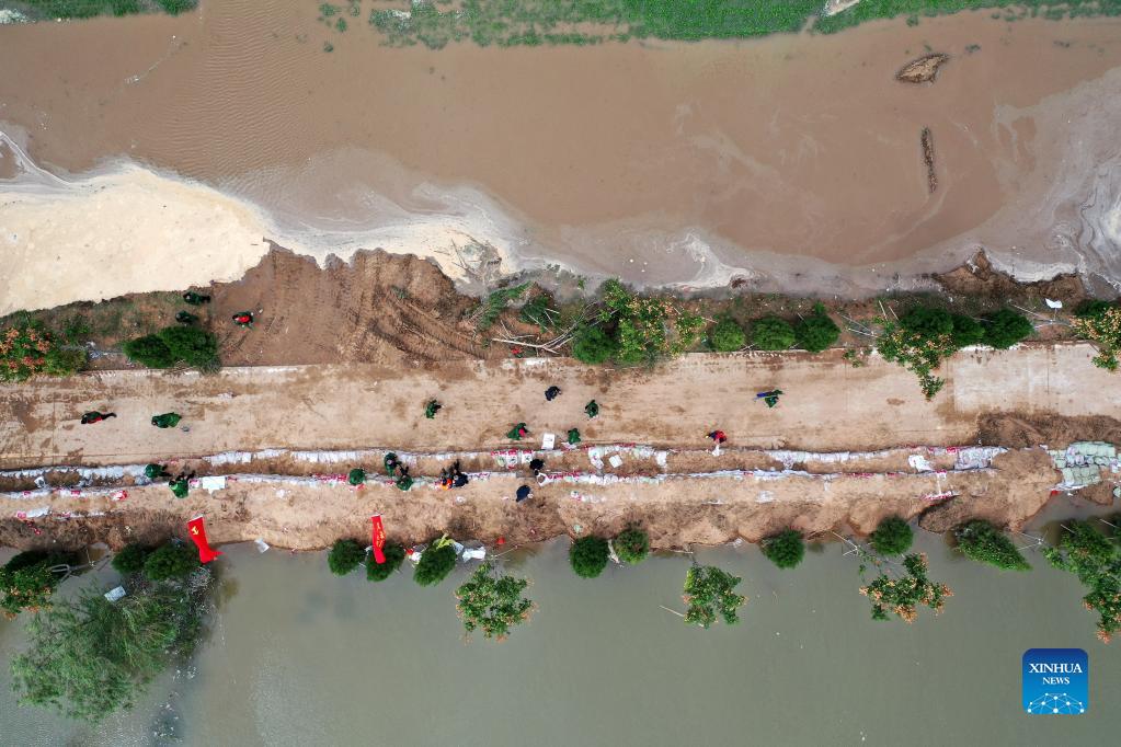 Aerial photo shows rescuers fortifying temporary dyke against the flood at Lianbo Village in Hejin City, north China's Shanxi Province, Oct. 10, 2021. More than 120,000 people have been temporarily evacuated after continuous downpours triggered floods in north China's Shanxi Province, authorities said Sunday. The floods have disrupted the lives of 1.76 million residents from 76 counties, cities and districts, according to the provincial department of emergency management. Some 190,000 hectares of crops were damaged and more than 17,000 houses collapsed, the department said. Emergency management departments of various levels have allocated 4,000 tents, 3,200 folding beds as well as cotton clothes and quilts for disaster relief. (Xinhua/Zhan Yan)