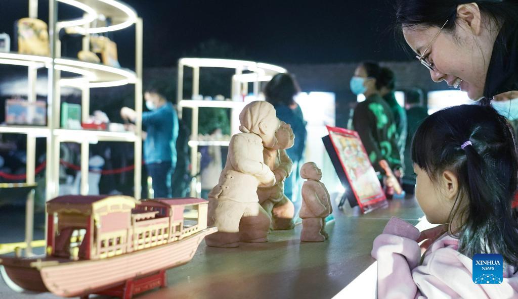 People view intangible cultural heritage products during the opening ceremony of 2021 Beijing (International) Canal Cultural Festival in Beijing, capital of China, Oct. 9, 2021. The cultural festival which kicked off on Saturday released a series of achievements regarding construction and protection of the grand canal cultural belt. (Xinhua/Chen Zhonghao)