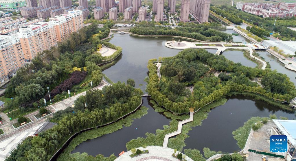 Aerial photo taken on Oct. 10, 2021 shows scenery of the Wenxinghu park in Huanghua City, north China's Hebei Province. In recent years, the coastal city of Huanghua has renovated abandoned pits, ponds and depressions with high degree of soil salinization, and built more than 80 parks and gardens. The urban ecological environment has been improved and citizens has more leisure space. (Xinhua/Luo Xuefeng)