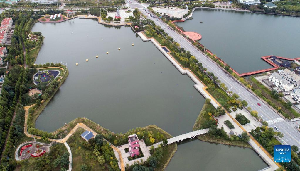 Aerial photo taken on Oct. 10, 2021 shows scenery of the Nanhai park in Huanghua City, north China's Hebei Province. In recent years, the coastal city of Huanghua has renovated abandoned pits, ponds and depressions with high degree of soil salinization, and built more than 80 parks and gardens. The urban ecological environment has been improved and citizens has more leisure space. (Xinhua/Luo Xuefeng)