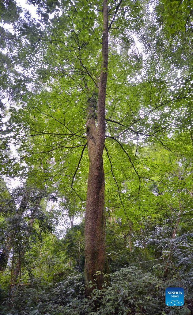 Photo taken on Oct. 8, 2021 shows an emmenopterys henryi tree in the Longquanshan city forest park in Chengdu, southwest China's Sichuan Province. A total of 35 emmenopterys henryi trees have been found in the city forest park. The plant is under China's second-class protection. (Xinhua/Liu Kun)
