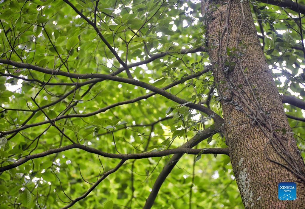 Photo taken on Oct. 8, 2021 shows an emmenopterys henryi tree in the Longquanshan city forest park in Chengdu, southwest China's Sichuan Province. A total of 35 emmenopterys henryi trees have been found in the city forest park. The plant is under China's second-class protection. (Xinhua/Liu Kun)