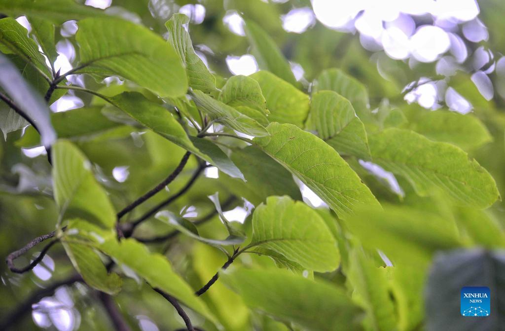 Photo taken on Oct. 8, 2021 shows branches of an emmenopterys henryi tree in the Longquanshan city forest park in Chengdu, southwest China's Sichuan Province. A total of 35 emmenopterys henryi trees have been found in the city forest park. The plant is under China's second-class protection. (Xinhua/Liu Kun)