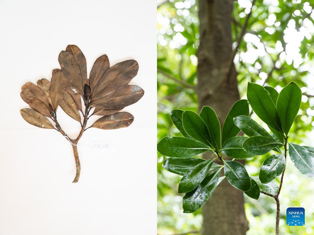 Combo photo taken on Oct. 10, 2021 shows a sample of Manglietiastrum sinicum collected by researchers in the wild (L) and a transplanted Manglietiastrum sinicum plant growing in the Kunming Botanical Garden in Kunming, southwest China's Yunnan Province. Kunming Botanical Garden has built a garden featuring Plant Species with Extremely Small Populations (PSESP) since 2015. Currently, a total of 44 rare target species have been transplanted into the garden under protection efforts. (Xinhua/Wang Nan)