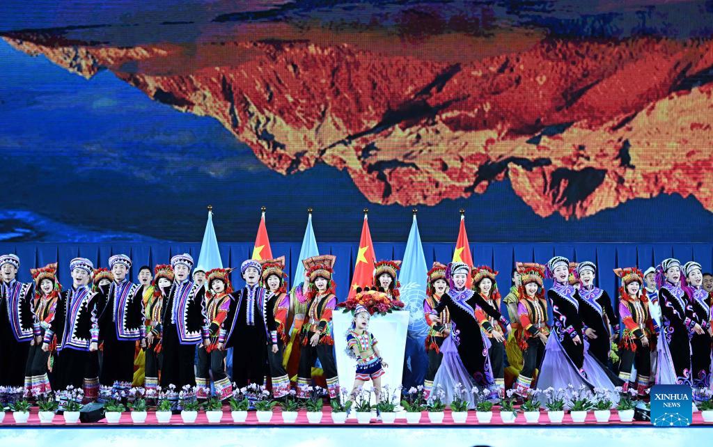 Folk artists perform during the opening ceremony of the 15th meeting of the Conference of the Parties to the UN Convention on Biological Diversity (COP15) in Kunming, southwest China's Yunnan Province, Oct. 11, 2021. COP15 kicked off in Kunming on Monday. (Xinhua/Chen Yehua)