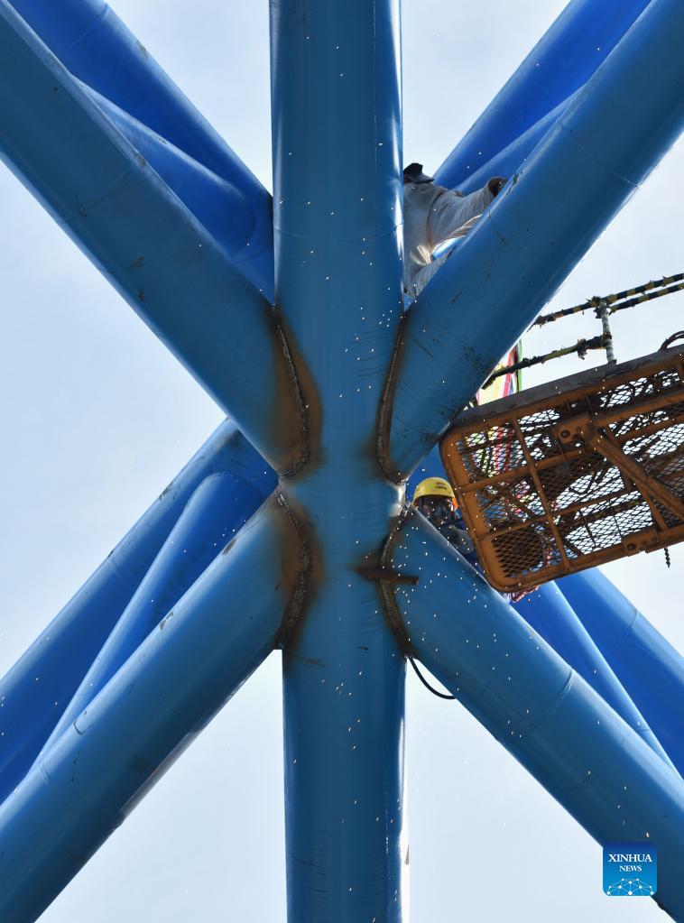 Constructors work at the construction site of Beizitou grand bridge in Huidong County of Huizhou, south China's Guangdong Province, Oct. 11, 2021. As part of the Guangzhou-Shanwei High Speed Railway, the 112-meter bridge finished its tied-arch closure on Monday. (Xinhua/Liu Dawei)