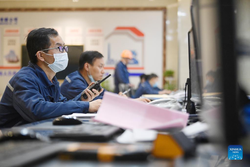 The staff of Xixia thermoelectric company monitor the operation of the equipment in the central control room in Yinchuan, northwest China's Ningxia Hui Autonomous Region, Oct. 11, 2021. The company started heating equipment maintenance work for the upcoming heating season. (Xinhua/Wang Peng)