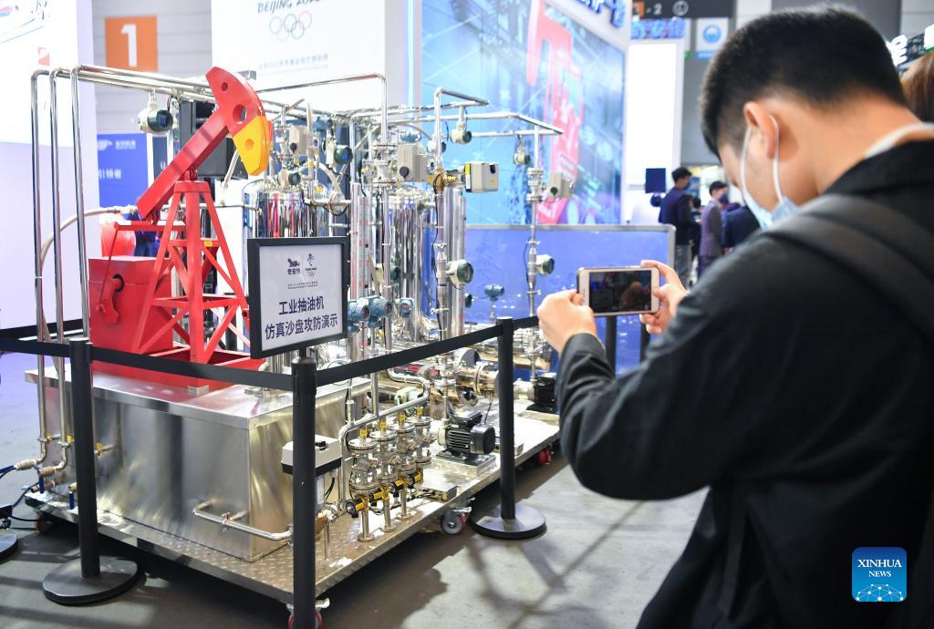 A visitor takes photo at the cybersecurity expo of 2021 China Cybersecurity Week in Xi'an, capital of northwest China's Shaanxi Province, Oct. 11, 2021. This year's edition of China's annual cybersecurity publicity week runs from Oct. 11 to 17 nationwide. (Xinhua/Zhang Bowen)