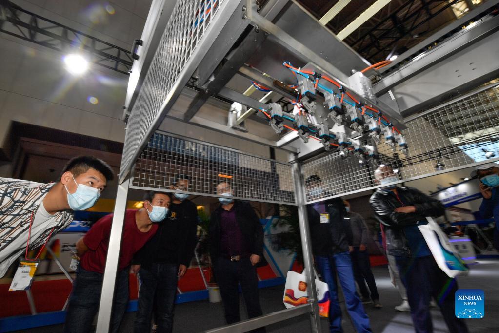 People watch automated equipment for making ice cream during Ice Cream China 2021 held in north China's Tianjin Municipality, Oct. 11, 2021. Ice Cream China 2021 opened Monday in north China's Tianjin Municipality, attracting more than 400 companies and nearly 10,000 buyers. (Xinhua/Sun Fanyue)
