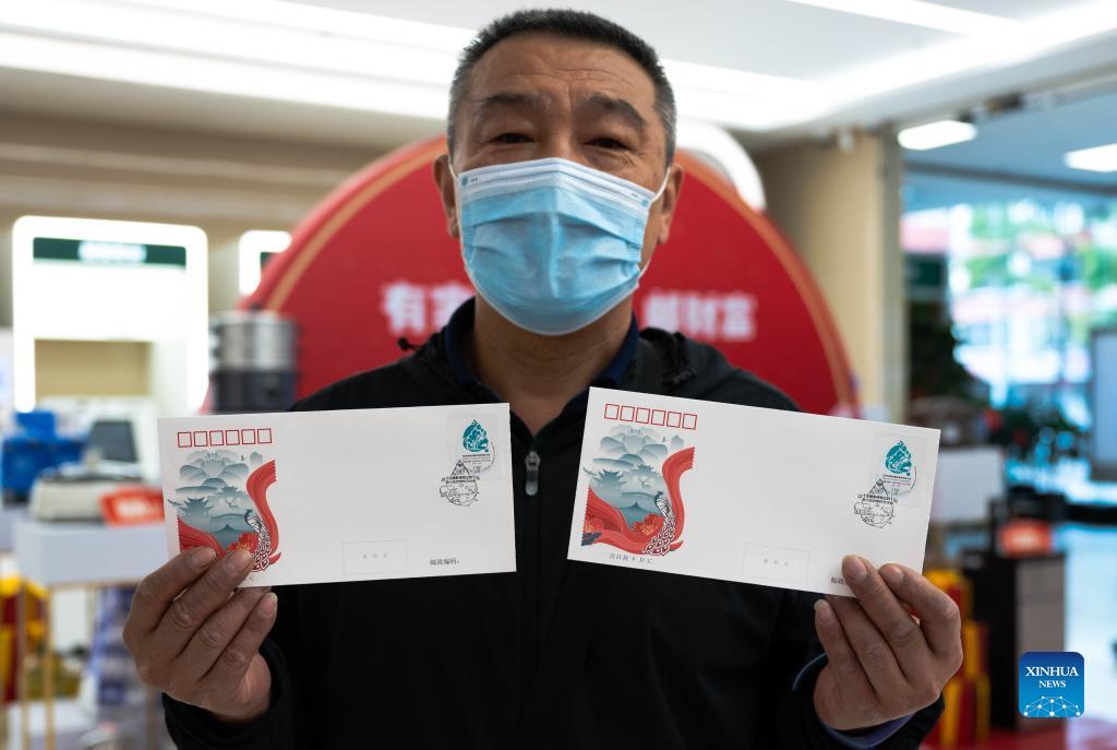An enthusiast shows the first day covers with commemorative stamps for the 15th meeting of the Conference of the Parties to the UN Convention on Biological Diversity (COP15) at a postal outlet in Kunming, southwest China's Yunnan Province, Oct. 11, 2021. China Post issued a commemorative stamp Monday for the COP15 that opened in Kunming. A total of 7 million of these stamps, with a denomination of 1.2 yuan (about 19 U.S. cents), can be purchased at designated postal outlets and online shops in the next six months. The stamp is in the shape of a water drop and was designed to highlight the concept that water is the source of life and all things. (Xinhua/Wang Guansen)