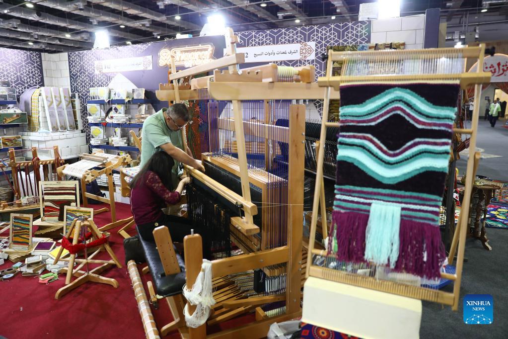 Artisans make traditional kilim at a heritage exhibition in Cairo, Egypt, on Oct. 10, 2021. Around 1,500 artisans specialized in heritage works have showcased their products in Egypt's largest annual heritage exhibition. Dubbed "Our Heritage", the exhibition organized by the Micro, Small and Medium Enterprise Development Agency, kicked off in Cairo on Oct. 9 and will conclude on Oct. 15. (Xinhua/Ahmed Gomaa)