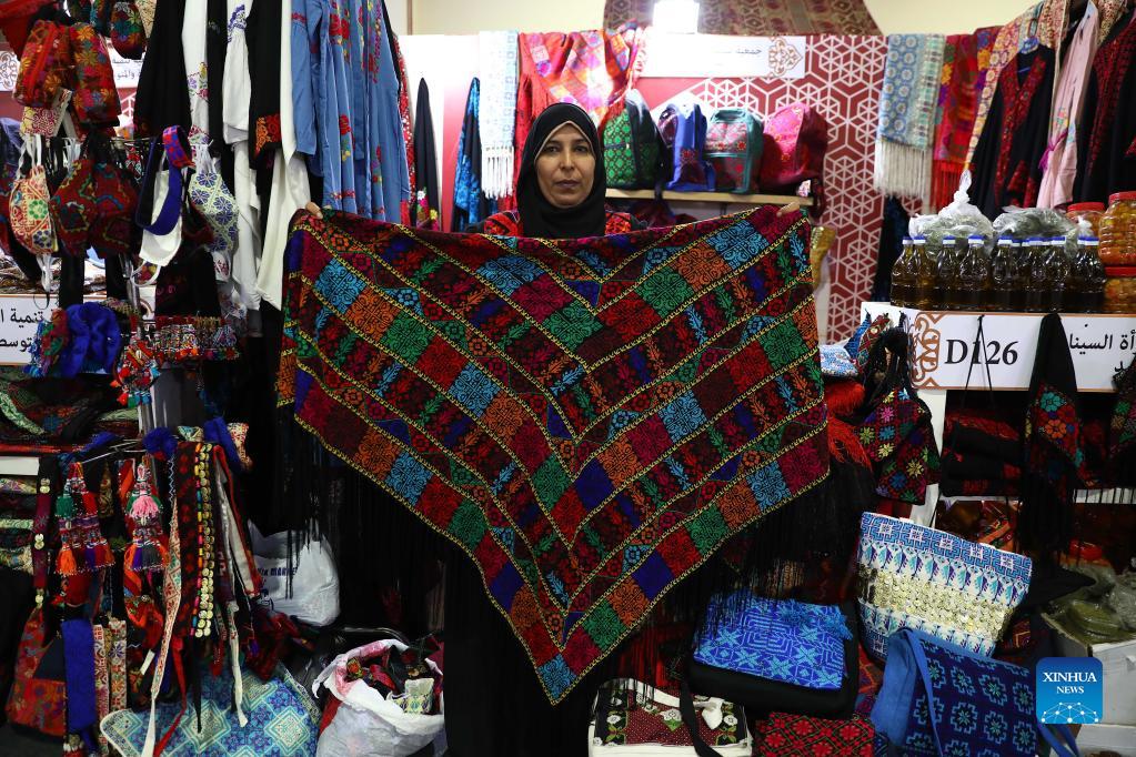 An exhibitor shows a piece of traditional clothing during a heritage exhibition in Cairo, Egypt, on Oct. 10, 2021. Around 1,500 artisans specialized in heritage works have showcased their products in Egypt's largest annual heritage exhibition. Dubbed "Our Heritage", the exhibition organized by the Micro, Small and Medium Enterprise Development Agency, kicked off in Cairo on Oct. 9 and will conclude on Oct. 15. (Xinhua/Ahmed Gomaa)
