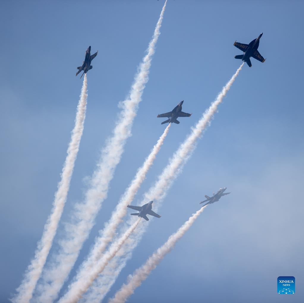 U.S. Navy aerobatics team Blue Angels perform during an air show of the annual Fleet Week activities in San Francisco, the United States, Oct. 10, 2021. (Photo by Dong Xudong/Xinhua)