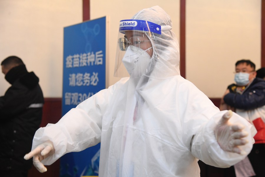 A community worker gives instruction to COVID-19 vaccine recipients at a community vaccination center in Haidian District of Beijing, capital of China, Jan. 31, 2021.(Xinhua/Ren Chao)