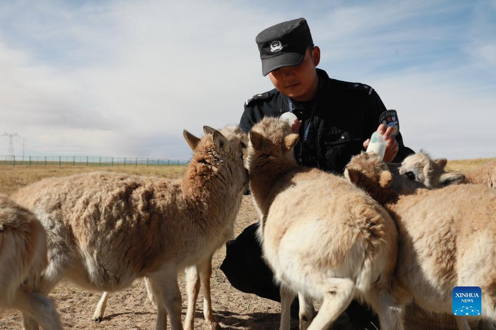 Patroller Deng Haiping of Sonam Dargye Protection Station feeds baby Tibetan antelopes with milk in Hoh Xil, northwest China's Qinghai Province, Dec. 6, 2020. The Hoh Xil National Nature Reserve is home to various wild animals. In 2002, the Sonam Dargye Protection Station in Hoh Xil founded a wildlife rescue center in an effort to strengthen the protection of wild animals. Since its foundation, the center has saved, fed and medically treated more than 600 wild animals including over 50 Tibetan antelopes. Tibetan antelopes are mostly found in the Tibet Autonomous Region, Qinghai Province and the Xinjiang Uygur Autonomous Region. The species is under first-class state protection in China. Working as "babysitters" at an altitude of over 4,400 meters, patrollers of Hoh Xil shoulder the responsibility of rescuing and taking care of baby Tibetan antelopes. (Xinhua/Wang Yan)