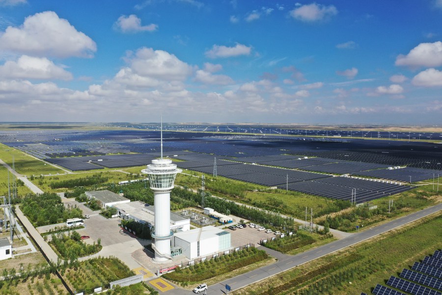 Aerial photo taken on Aug. 5, 2020 shows a photovoltaic power station at the green industrial development park in the Tibetan Autonomous Prefecture of Hainan, northwest China's Qinghai Province. (Xinhua/Xing Guangli)