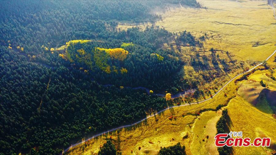 The Mati Temple is seen in the autumn forests in Sunan Yugur Autonomous County , Gansu province. (Photo/Wu Xuefeng)