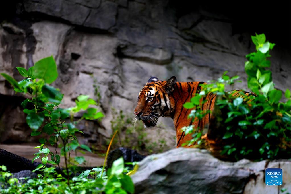 Photo taken on Oct. 11, 2021 shows a South China tiger at the Shanghai Zoo in east China's Shanghai. The South China tiger is a rare kind endemic to China and is on the national first-class protection list. Currently, a total of 28 South China tigers are living in the Shanghai Zoo. The zoo has recorded each tiger's information and established a gene bank for research, and tigers are treated and bred in a scientific way. (Xinhua/Zhang Jiansong)