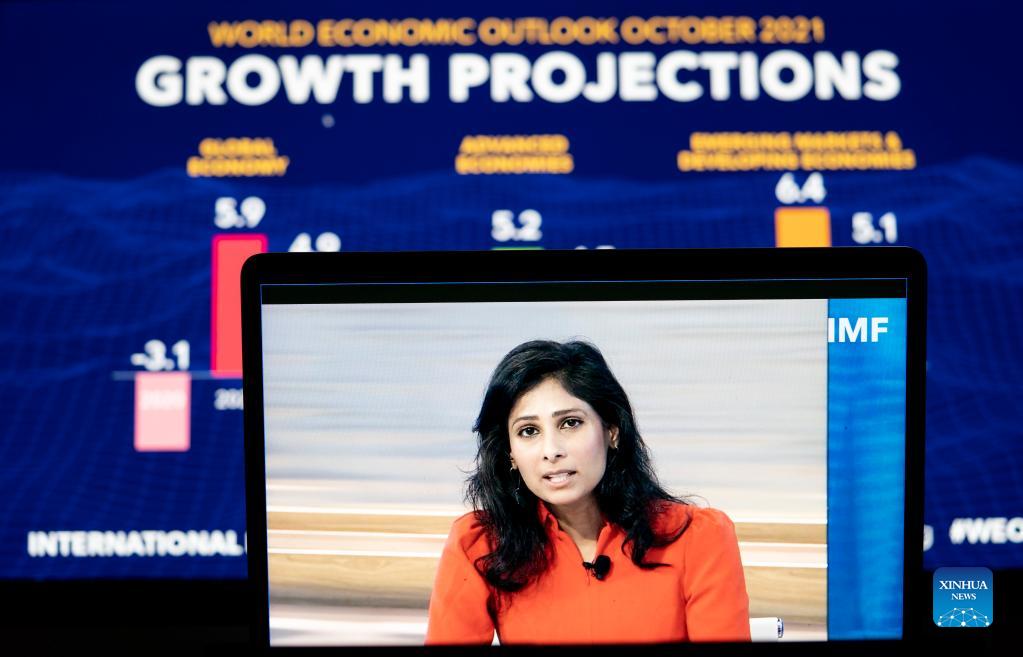 The International Monetary Fund (IMF) Chief Economist Gita Gopinath speaks at a virtual press briefing during the annual meetings of the IMF and the World Bank Group in Washington, D.C., the United States, on Oct. 12, 2021. The International Monetary Fund (IMF) on Tuesday projected that the global economy would grow by 5.9 percent in 2021, down by 0.1 percentage point from July's forecast, according to the latest World Economic Outlook (WEO). (Xinhua/Liu Jie)