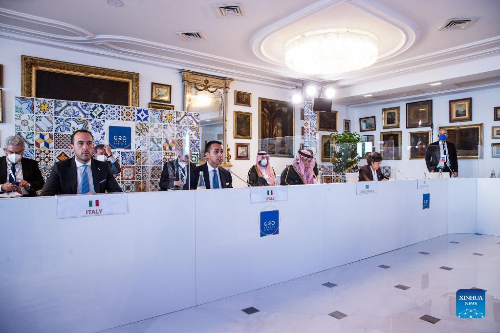 Italian Foreign Minister Luigi Di Maio (2nd L, Front) attends the G20 Trade and Investment Ministerial Meeting in Sorrento, southern Italy, on Oct. 12, 2021. Luigi Di Maio on Tuesday called on ministers from the Group of 20 (G20) to reinforce the global trade system through the World Trade Organization (WTO). (G20 Italy/Handout via Xinhua)
