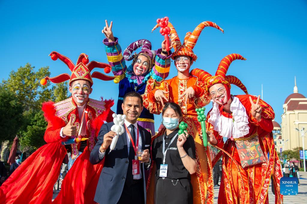 Participants pose for photos during the 2021 Global Digital Trade Conference and Wuhan (Hankoubei) Commodities Fair in Wuhan, capital of central China's Hubei Province, Oct. 12, 2021. (Photo by Wu Zhizun/Xinhua)