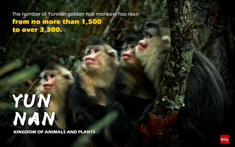 The number of Yunnan golden hair monkeys has risen from no more than 1,500 to over 3,300.