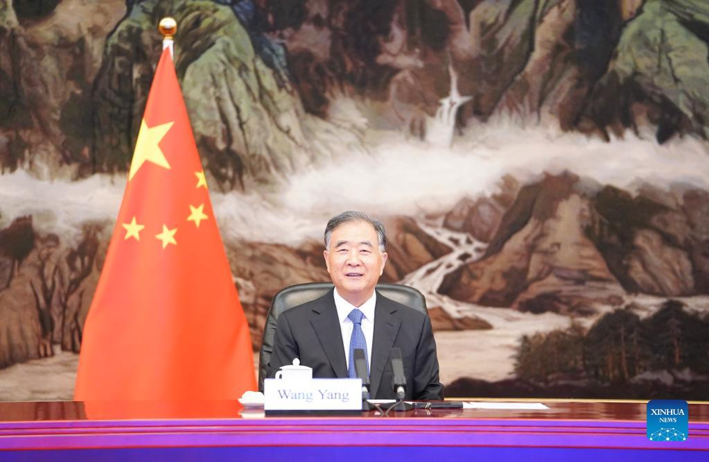 Wang Yang, chairman of the Chinese People's Political Consultative Conference National Committee, meets with Cambodia's Senate President Samdech Say Chhum via video link in Beijing, capital of China, Oct. 12, 2021. (Xinhua/Li Xiang)