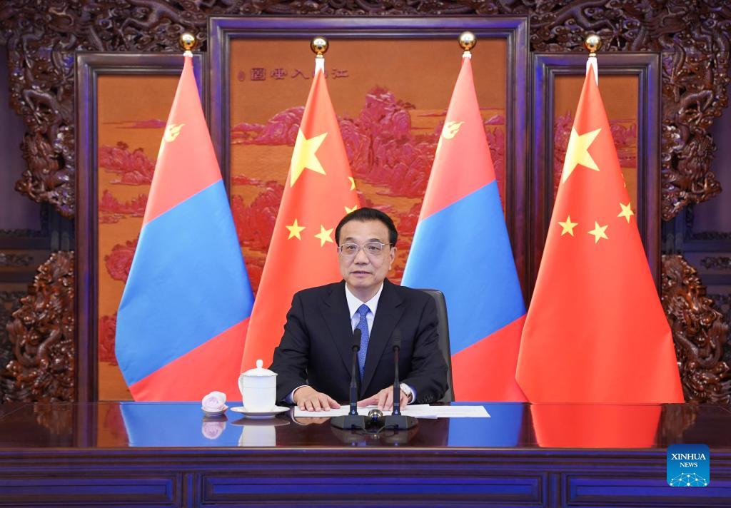 Chinese Premier Li Keqiang meets with Mongolian Prime Minister Luvsannamsrai Oyun-Erdene via video link in Beijing, capital of China, Oct. 12, 2021. (Xinhua/Zhang Ling)