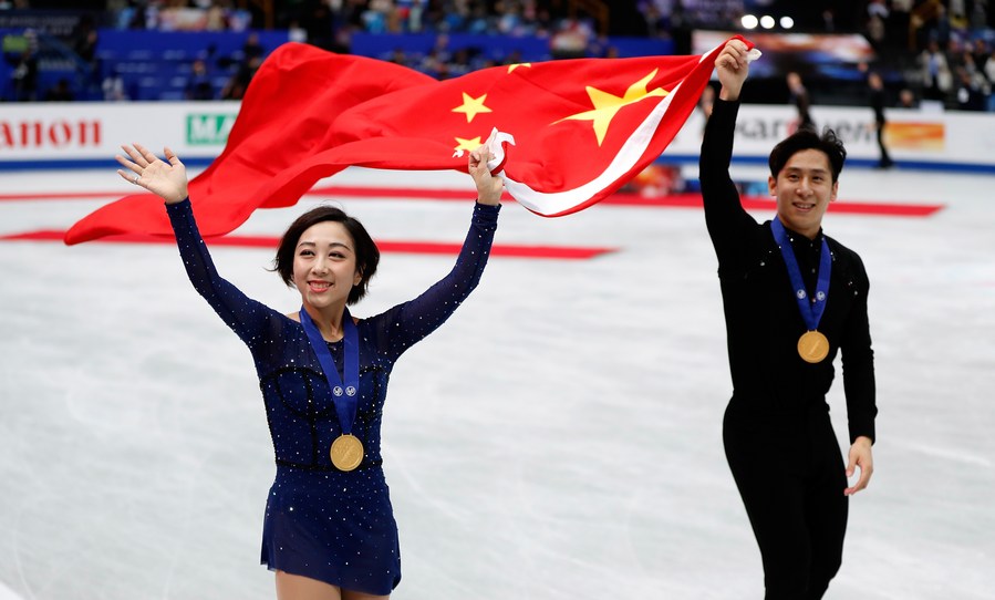 Gold medalists Sui Wenjing (L)/Han Cong celebrate after the awarding ceremony for pairs of 2019 ISU World Figure Skating Championships at Saitama Super Arena in Saitama, Japan. (Xinhua/Wang Lili)