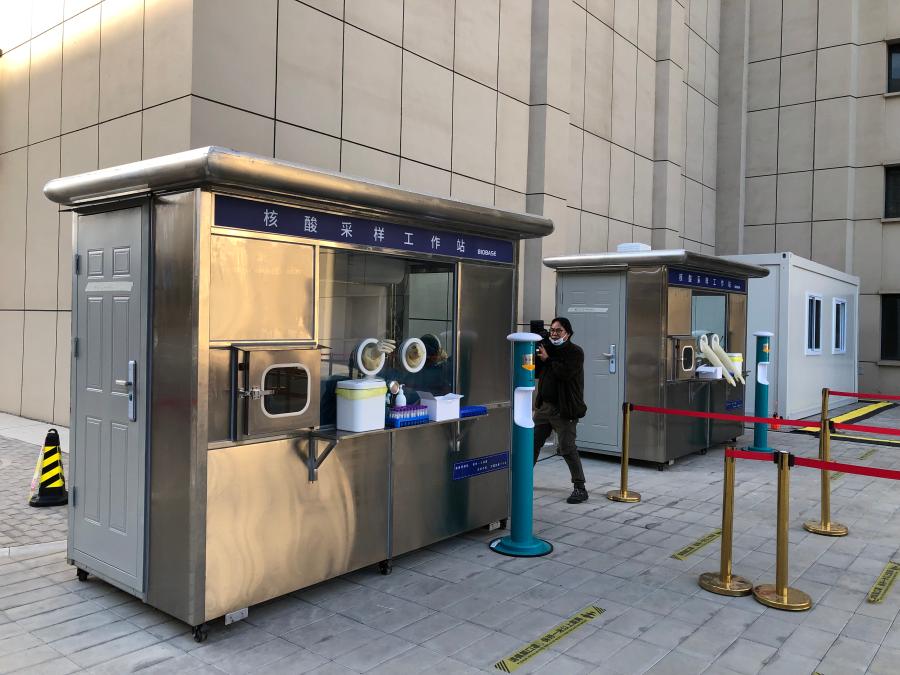 A nucleic acid test booth in the Capital Gymnasium compound on Oct. 12, 2021. (Xinhua/Pan Yi)