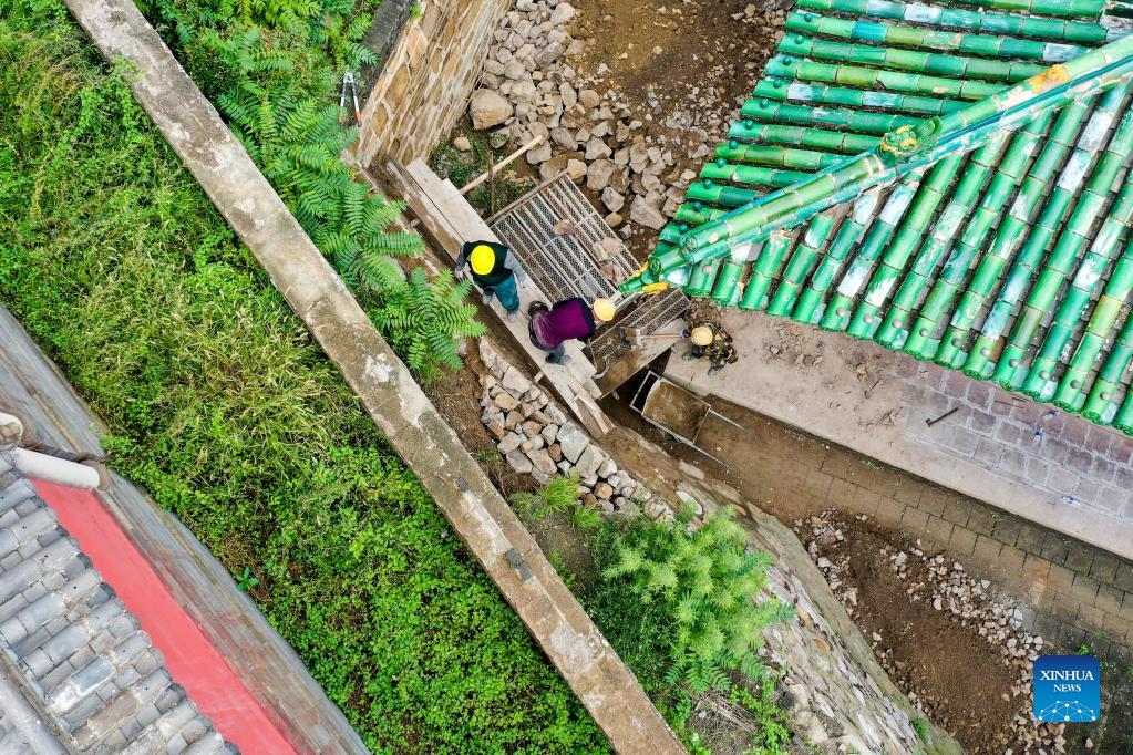 Workers repair a building structure damaged during a flood at the Jinci Temple Museum in Taiyuan, capital of north China's Shanxi Province, Oct. 12, 2021. Shanxi has recently been hit by continuous rainstorms, which led to flooding in multiple parts of the province. More than 1,000 cultural heritage sites and buildings have suffered structural damage due to the extreme weather. Local cultural heritage authority is conducting repair work on the cultural relics damaged in the recent flood. (Xinhua/Cao Yang)