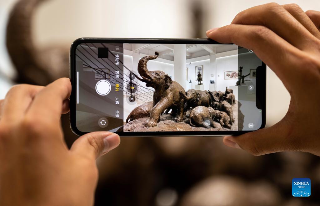 A visitor takes photos at an art exhibition featuring biodiversity in Kunming, southwest China's Yunnan Province, Oct. 12, 2021. The exhibition lasts till Nov. 9. (Xinhua/Wang Guansen)