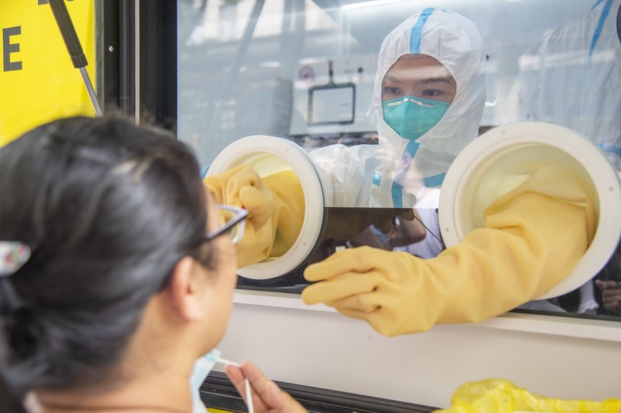 A medical worker works in a mobile lab for COVID-19 nucleic acid testing in Wuchang District of Wuhan, central China's Hubei Province, Aug. 5, 2021. (Photo by Wu Zhizun/Xinhua)