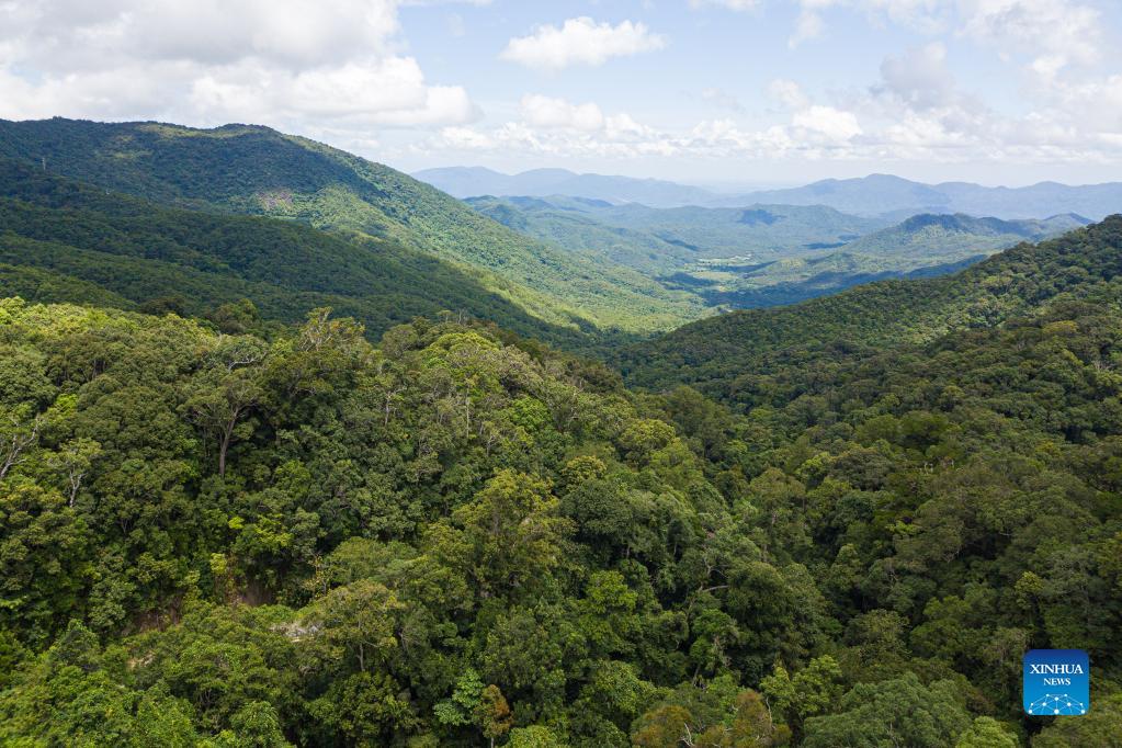 Aerial photo taken on Sept. 9, 2021 shows the view of the Hainan Tropical Rainforest National Park in south China's Hainan Province. The Hainan Tropical Rainforest National Park in south China's Hainan Province boasts one of the most concentrated, best preserved and largest contiguous tropical rainforests in China. The park covers nine cities and counties, with a total area of 4,400 square km, or about one-seventh of Hainan Island's land area. It is an important part of the world's tropical rainforest and a key area for biodiversity conservation in China. (Xinhua/Pu Xiaoxu)