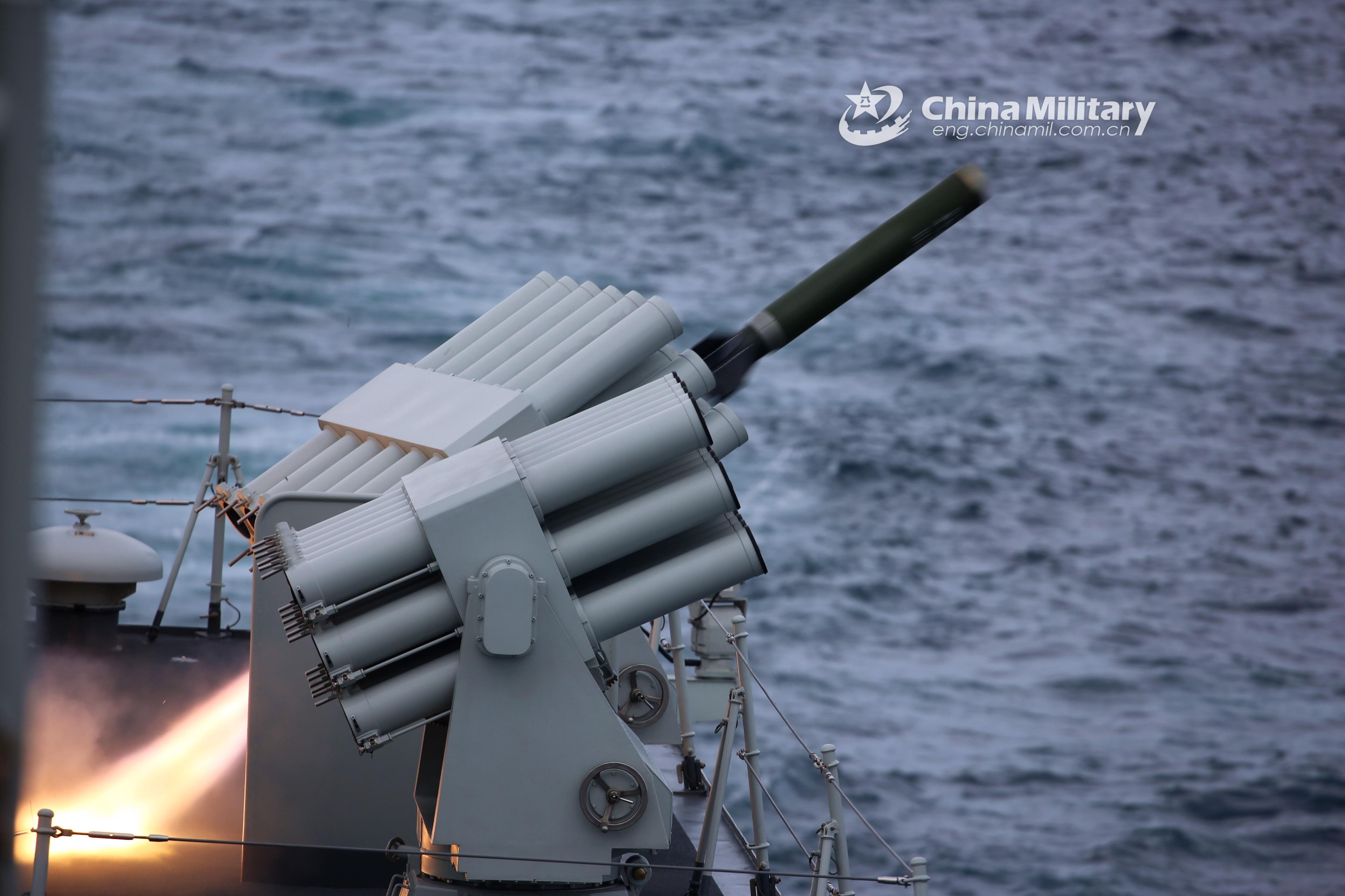The guided-missile destroyer Suzhou (Hull 132) attached to a destroyer flotilla with the navy under the PLA Eastern Theater Command fires jamming bombs to mask the movement and avoid the simulated missile attack during a maritime combat-readiness patrol mission in early October, 2021. (eng.chinamil.com.cn/Photo by Wen Zidong)