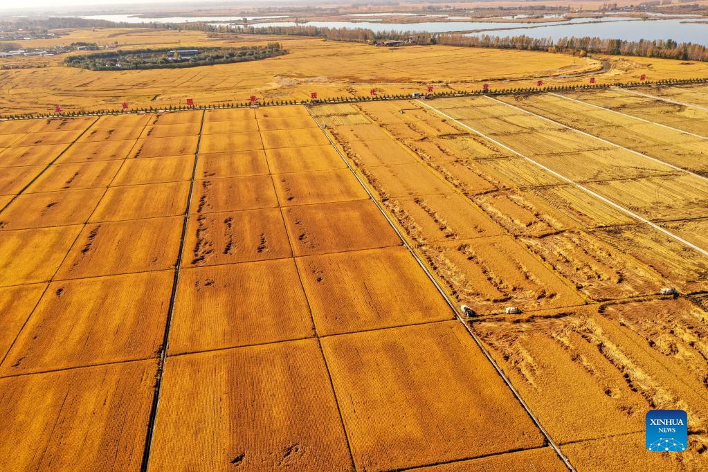 Aerial photo taken on Oct. 12, 2021 shows farmers operating rice harvesters in Wanchang Town of Yongji County in Jilin City, northeast China's Jilin Province. (Xinhua/Zhang Nan)