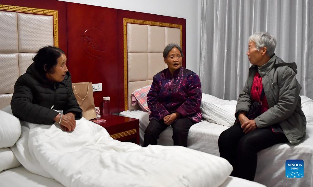 Residents stricken by the flood rest at a temporary relocation site in Dali County of Weinan City, northwest China's Shaanxi Province, Oct. 11, 2021. Nearly 240,000 people were affected by the floods due to continuous downpours in Dali County of Shaanxi Province. So far, more than 25,000 people have been evacuated to temporary relocation sites offering accommodation and medical services. (Xinhua/Liu Xiao)